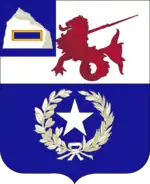 - Shield- Parti per fess Argent and Azure, in chief a sea lion holding in dexter paw a musket with bayonet Gules, in base a mullet within a wreath both of the first; on a canton of the second a rock of the first charged with a shoulder strap of a second lieutenant of Infantry of 1863 Proper.