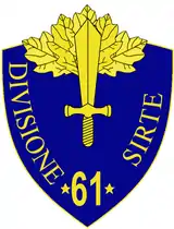 The 61st Infantry Division "Sirte" (Italian: 61ª Divisione di fanteria "Sirte") was an infantry division of the Royal Italian Army during World War II. The division was formed on 9 May 1937 in Misrata in Italian Libya and named for the Libyan city of Sirte. The division's regimental depots were in mainland Italy in Calabria and shared with the 27th Infantry Division "Brescia", with both divisions recruiting their troops from and training them there. The division was destroyed on 22 January 1941 during the British capture of Tobruk and officially declared lost on 23 January 1941.[1][2] The Sirte was classified as an auto-transportable division, meaning it had some motorized transport, but not enough to move the entire division at once.