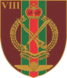 The 8th Battalion (Parachute), Royal Ranger Regiment (Malay: Batalion ke-8 Rejimen Renjer Diraja (Para)), better known as the 8 RRD or 8 RRD (Para) – abbreviation from its local name, is a battalion-sized airborne infantry from the Royal Ranger Regiment of the Malaysian Army. On 10 October 1994 the 8 RRD became part of the 10th Parachute Brigade. The 8 RRD is the first infantry unit in the Malaysian Army transformed from a conventional to an airborne unit.[2][3]