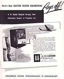 In 1945, he created the A. W. Haydon company [2] in Waterbury, producing timing motors and related devices.[3][4] Haydon sold this company, and many of his patents, in 1951 to North American Philips for over $1,000,000.[5][6] The A.W. Haydon Company was not dissolved, but was used to handle all sales of the new Division of Phillips. Haydon continued as chief executive of the new Phillips Division. At approximately the same time, Haydon formed a new company named "Haydon Switch, Inc." to produce and distribute precision devices called the miniature snap-action switch which he had invented typified by patents granted as "Snap Action Switch" US Patent #2,700,079;[7] US Patent #2,773,954;[8] US Patent # 2,773,955.[9]