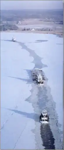 Red Birch was used for light icebreaking in the James,[24] Nanticoke,[25] and Wicomico Rivers.[26] This was an important mission in that a number of communities relied on heating oil, gasoline, and fuel oil for power plants delivered by barges on these waterways.[27] The Surry nuclear power plant was shut down briefly in January 1977 when the James River, its source for cooling water, froze. Red Birch was sent to break up the ice so the plant could restart its operations.[28] Her icebreaking was sometimes used to free ships that had been frozen in.[29]