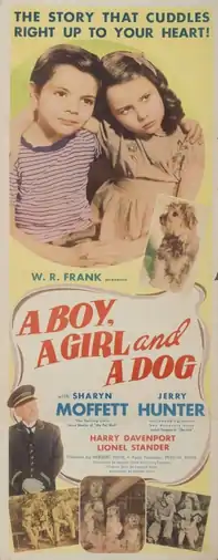 A Boy, a Girl and a Dog is a 1946 American drama film directed by Herbert Kline and written by Maurice Clark, Irving Fineman and Herbert Kline. The film stars Sharyn Moffett, Jerry Hunter, Harry Davenport, Lionel Stander, Charles Williams and Charlotte Treadway. The film, shot in part at the War Department's Canine Training Center in San Carlos, California was completed in 1944 [1] but was not released until July 1, 1946, by Film Classics.[2][3][4] The film was rereleased in 1951 by Astor Pictures as Lucky, the Outcast.[5]