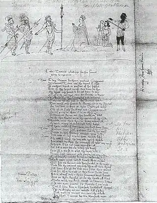 An important piece of evidence relating to both the dating and text of Titus is the so-called 'Peacham drawing' or 'Longleat manuscript'; the only surviving contemporary Shakespearean illustration, now residing in the library of the Marquess of Bath at Longleat. The drawing appears to depict a performance of Titus, under which is quoted some dialogue. Eugene M. Waith argues of the illustration that "the gestures and costumes give us a more vivid impression of the visual impact of Elizabethan acting than we get from any other source."[55]