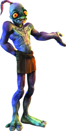 Abe is the most strongly developed central character of the Oddworld series. He was inspired by the diamond miners of South Africa, who along with other indigenous peoples have suffered the ruthless harvesting of their land and people by industrial profiteers.[2] He evolves and develops throughout the first game, Abe's Oddysee.[3] He is initially a slave along with his fellow Mudokons, but escapes.[4] The game's narrative and its main character deal with ethical and moral issues. Lorne Lanning, Oddworld's creator, has stated that its "characters are driven in a way that is fired by larger issues."[4] Abe was the first protagonist that Oddworld Inhabitants developed.[5] Lanning stated that Abe was named after Abraham of the Old Testament, because of the similarities between Abe trying to discover himself and for what he believes was the difficulty in trying to determine the true source of Abraham's discovery of monotheism: