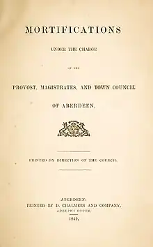 - ↑ Text taken from pp. 106–108 of: Aberdeen (Scotland). Town Council., Mortifications under the Charge of the Provost, Magistrates and Town Council of Aberdeen (Aberdeen: Chambers, 1849).