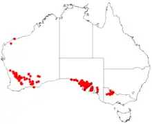 It has a scattered distribution through southern Western AustraliaW, south-eastern parts of South Australia and north-western Victoria.[2] In Western Australia it is found in the Wheatbelt and Goldfields-Esperance regions and is commonly situated on hills, plains, and ridges growing in clay, sandy or loamy soils often over or around limestone.[1]