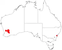 It is native to an area in the Wheatbelt region of Western Australia where it is found among granite outcrops and boulders growing in pockets of sandy loamy soils.[1] It is found from around Wongan Hills in the north west to Hyden in the south east where it is a part of scrubland communities.[2]
