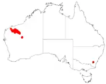 It is native to an area in the Pilbara region of Western Australia[2] mostly in the Hamersley Range around Newman in the east extending through Wittenoom and Paraburdoo in the west with small outlier populations in the Carnarvon Range in the Little Sandy Desert. It is usually situated along ridges and on the higher slopes of ranges, in rocky gullies and on scree slopes and occasionally in the creeklines that flow down from the ranges. It will grow in iron-rich skeletal soils over ironstone bed rock.