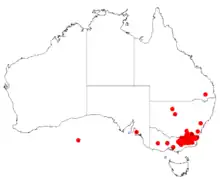 It is native to south eastern parts of New South Wales in the Great Dividing Range and north eastern parts of Victoria.[1] Its range is from around Tumut in the north to around Omeo in the south where it is often found on the lower slopes, on granite hillsides, along river flats and in gullies as a part of dry sclerophyll forest and woodland communities.[2]