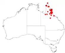 It has a scattered distribution over the Cape York Peninsula of Far North Queensland down to around Herberton in the south where it is commonly situated on hills and along creeks growing in sandy soils.[2] The plant is quite common around the Irvinebank area.[1]