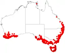 It is also found in coastal areas of South Australia east of the Eyre Peninsula extending coastal areas of Victoria and New South Wales and north into Queensland as far as Gladstone. It is also found in coastal areas of Tasmania.[5]
