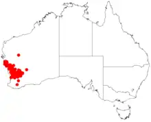 It is found from the Mid West, extending through the Wheatbelt and into the Goldfields-Esperance regions of Western Australia. It is found as far north as Northampton to coastal suburbs of Perth in the south and out to Westonia in the east. Isolated populations are also found near Tambellup and Menzies. The plant is found in a variety of habitats growing in rocky or gravelly loam soils over or around granite.[1]