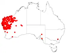 It is found throughout the Pilbara, Midwest and northern parts of the Wheatbelt in Western Australia. The range extends from the Pilbara south to around Mingenew and Mount Magnet in the south with isolated populations found around Lake Carnegie and Wongan Hills. It grows in a variety of soil types usually as a part of shrubland and riparian woodland communities.[3]