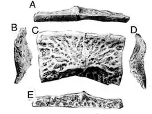 Trunk vertebrae are the only non-sacral vertebrae identified on Acaenasuchus thus far. Each is similar in size and includes centrum, neural arches, zygapophyses, and transverse processes. The centrum is amphicoelous, and includes longitudinal depressions on the lateral surfaces just below the neural arch.[9] The neural arch is flat, similar to E. olseni, and dorsoventrally short.[9] The most distal end of the transverse process includes ornamentation in the form of small pits and grooves.[9] The zygapophyses are situated close to each other along the midline of each trunk vertebrae.[9] Sacral vertebrae identified in Acaenasuchus have been reconstructed from fragments of sacral ribs, sacral centra, and sacral vertebra.[9] The centrum is amphicoelous and short much like the trunk vertebrae. The sacral rib is found on the anterior side of the centrum. The neural arch is short. The zygapophyses are separated by a thin slot.[9]