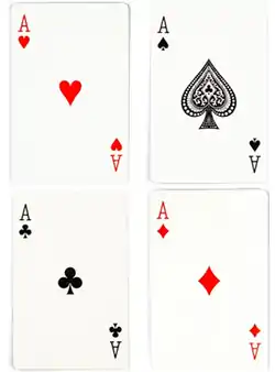 An ace is a playing card, die or domino with a single pip. In the standard French deck, an ace has a single suit symbol (a heart, diamond, spade, or a club) located in the middle of the card, sometimes large and decorated, especially in the case of the ace of spades. This embellishment on the ace of spades started when King James VI of Scotland and I of England required an insignia of the printing house to be printed on the ace of spades. This insignia was necessary for identifying the printing house and stamping it as having paid the new stamp tax.[1] Although this requirement was abolished in 1960, the tradition has been kept by many card makers.[2] In other countries the stamp and embellishments are usually found on ace cards; clubs in France, diamonds in Russia, and hearts in Genoa because they have the most blank space.