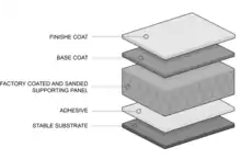 Acoustic plaster is plaster which contains fibres or aggregate so that it absorbs sound. Early plasters contained asbestos, but newer ones consist of a base layer of absorptive substrate panels, which are typically mineral wool, or a non-combustible inorganic blow-glass granulate. A first finishing layer is then applied on top of the substrate panels, and sometimes a second finishing layer is added for greater sound attenuation. Pre-made acoustic panels are more commonly used, but acoustic plaster provides a smooth and seamless appearance, and greater flexibility for readjustment. The drawback is the greater level of skill required in application. Proprietary types of acoustic plaster developed in the 1920s included Macoustic Plaster, Sabinite, Kalite, Wyodak, Old Newark and Sprayo-Flake produced by companies such as US Gypsum.