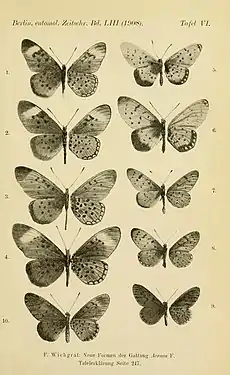 - ↑ Wichgraf, F., 1909 Beschreibung neuer Formen der Gattung Acraea F. aus Rhodesia, Mashunaland und Angola. Berliner Entomologische Zeitschrift 53:240-247. Plate 6