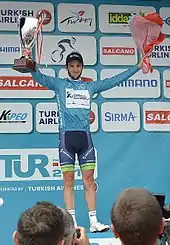 Yates's breakthrough results came at the Tour of Turkey in late April and early May 2014. He had been one of the team's protected riders for the general classification, along with his brother.[12] On the third stage, he became the de facto team leader after Simon crashed out of the race.[13] Yates was the only person to follow an attack by Rein Taaramäe on the final climb to Elmalı, and ultimately finished the stage in second place, six seconds down on Taaramäe after he had attacked again in the closing metres.[14] After two stages that suited the sprinters, Yates achieved his first professional victory on the sixth stage, finishing at the House of the Virgin Mary in Selçuk. A reduced peloton had formed on the final climb from which Yates attacked with around a kilometre remaining. Yates held off the chasers – led home by Davide Formolo and Davide Rebellin, two seconds in arrears – and was able to take the leader's blue jersey from Taaramäe, who crossed the line seven seconds behind Yates.[15][16] Yates held the race lead until its conclusion in Istanbul two days later; he extended his lead by a further four seconds on the final stage, as there was a split on the run-in, with only a 28-rider group being given the same time as stage winner, Mark Cavendish.[17] He later described the victory – the first British overall win at the Tour of Turkey – as "unexpected", having set out with the ambition of winning stages.[18]