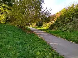 It occupies the track route and green buffering land of the demolished Addiscombe Line, a short railway that ran between Lower Addiscombe Road and Woodside Junction near Blackhorse Lane tram stop, a branch line off what was the Woodside and South Croydon Joint Railway (WSCJR). The site of Addiscombe railway station has been turned into housing. Most of the route of the WSCJR, the parent line, is part of Tramlink.
