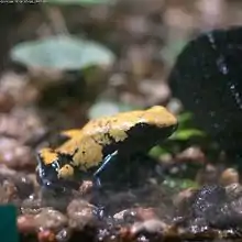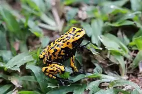The best known variants of this species are black below and yellow, orange or red above, but its color is extremely variable with some having whitish-mint or light blue upperparts, some having a mottled or spotted pattern above, and some being almost all whitish (popularly known as "moonshine" among captive frog keepers), yellow-orange or black.[4] It has been speculated that some morphs were separate species, but genetic testing have revealed virtually no difference between them (including a distinctive variant from Cristalino State Park with a yellow-and-black netted pattern) and the distributions of the morphs do not follow a clear geographic pattern as expected if they were separate species.[4] This relatively large poison dart frog has a snout-vent length of up to 42 mm (1.7 in).[4]