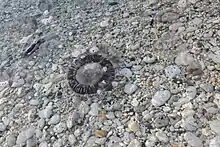During the medusa stage of the life cycle, members of the A. forskalea species have large umbrellas which are thick near the center but gradually thin as they reach the margin of the umbrella.[4][6] The stomach takes up roughly half of the overall width of the disc.[4] Typically, this species has between 60 and 80 radial canals; however, individuals have been identified as A. forskalea with even fewer or as many as 160 canals.[4] The gonads of this species run throughout nearly the entire width of this hydrozoan.[4] The number of tentacles is usually fewer than the amount of radial canals per individual, but findings have shown that this can vary from half as many to twice as many.[4] The umbrella for this species may span up to 175 mm across.[4] There are small bulbs scattered around the marginal region while bulbs on the tentacles are conical and elongated.[7][8] Also, A. forskalea has excretory pores on short papillae and between 5-10 statocysts between neighboring radial canals.[7][8] Despite containing a bioluminescent protein, aequorin, this species (as well as all other species in the genus) are almost completely colorless.[9]