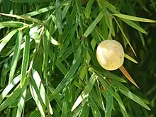 The seed cones are highly modified, with a single 2 cm (1 in) diameter seed with a thin fleshy coating borne on a short peduncle. The mature seed is purple, and is dispersed by birds and monkeys which eat the fleshy coating. The pollen cones are solitary or in clusters of two or three on a short stem.[4]