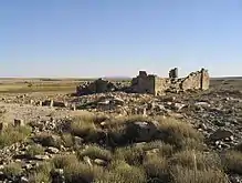 The ruins of Aggar, whose identity is confirmed by inscriptions found there, include those of a triumphal arch opening onto a large porticoed area, with a temple behind it, which must have been the forum and the capitol. A Byzantine fortress, 30 m square with square, slightly projecting corner towers was built on an arcaded structure identified as a temple of Juno. Another temple of unidentified dedication adjoins this citadel. Outside the city proper stands a two-storey mausoleum of a certain C. Marius Romanus with roofing almost intact. A ruined theatre can also be seen. About 1500 metres west of the town, the wadi Jilf was crossed by a bridge originally of ten arches, of which six remain.[1][4]