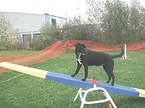 The seesaw, sometimes called the teeter-totter, is a seesaw, that the dogs walks the length of, the seesaw varies between 8 and 12 feet (2.4 and 3.7 m) in length and the apex between 16 and 27 inches (41 and 69 cm) in height.[8]