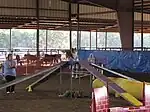 Contact obstacles are obstacles made of planks and ramps, they require dogs to ascend and descend the obstacle and to place a paw on a "contact zone", an area that is painted a different colour.[4] The height, width and angle of the planks and ramps varies by the organisation running the competition.[4]