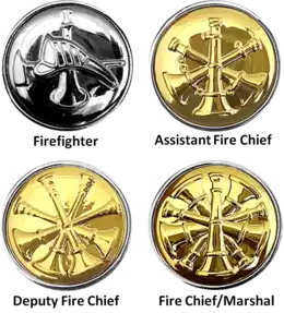 The center shield, or "scramble," of the firefighter's badge is replaced with different bugles to denote different fire officers. One silver bugle with a crossed fire ax and helmet is worn by firefighters, three gold bugles is worn by Assistant Fire Chiefs, four gold bugles for Deputy Fire Chiefs, and five gold bugles for Fire Chiefs and Base Fire Marshals.[2][3]