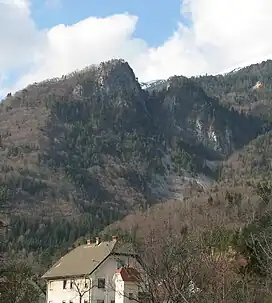 A settlement from late Antiquity has been found just below the summit and evidence shows that it was probably inhabited much earlier. Excavations began in 1976. Most evidence is from the period immediately after the collapse of the Roman Empire (476 AD), when it seems locals moved to the safety of the peak from the valley below during a period of upheaval and migration of various Germanic and Slavic tribes through the region. With its location high above the valley with a natural precipitous barrier towards the south and an excellent view up and down the Upper Sava Valley, Ajdna was an ideal location for a defendable settlement. A number of other high-elevation settlements from the period between the 4th and 6th centuries have been found in the area of Slovenia, but Ajdna lies at the highest elevation of all. Remains of a total of 25 buildings have been excavated, including an early Christian temple. In a nearby building eleven graves have been excavated and the potsherds, weapons, and jewellery found are on display in the museum in Kranj.[1] It is believed this was not the main burial ground which has so far not been discovered. The remains of the religious building have been conserved, roofed over and are open to visitors.[2]