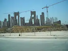 Al-Rahman Mosque (Arabic: جامع الرحمان; transliterates: Mosque of The Most Merciful) in Baghdad, was intended to be one of the largest mosques in Iraq. It was begun by Saddam Hussein in 1998, but work was cut short during the 2003 invasion of Iraq and it was never completed and only its skeleton remains today. It remains uncompleted in Baghdad's Mansour neighbourhood, in the place of the old race track. Its main, uncompleted dome, is surrounded by eight smaller, independent domes, which in turn feature eight even smaller domes integrated into their walls. It is approximately 250 metres (820 ft) in diameter, and occupies 4.5 hectares (11 acres).[2][3][4][5]