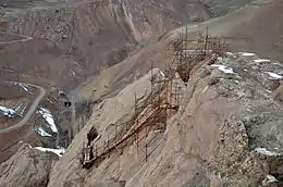 According to Ata-Malik Juvayni during the assault on the Alamut fort, "Khitayan" built siege weapons resembling crossbows were used.[14][15][16] "Khitayan" meant Chinese and it was a type of arcuballista, deployed in 1256 under Hulagu's command.[17] Stones were knocked off the castle and the bolts "burnt" a great number of the Assassins. They could fire a distance around 2,500 paces.[18] The device was described as an ox's bow.[19] Pitch which was lit on fire was applied to the bolts of the weapon before firing.[20] Another historian thinks that instead gunpowder might have been strapped onto the bolts which caused the burns during the battle recorded by Juvayini.[21]