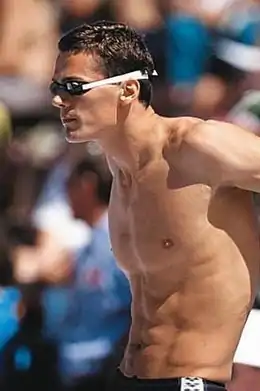 Aleksandr Vladimirovich Popov (Russian: Алекса́ндр Влади́мирович Попо́в, born 16 November 1971), better known as Alexander Popov, is a former Russian swimmer. Widely considered the greatest sprint swimmer in history, Popov won gold in the 50-metre and 100 m freestyle at the 1992 Olympics and repeated the feat at the 1996 Olympics, and is the only male in Olympic games history to defend both titles.[4] He held the world record in the 50 m for eight years, and the 100 m for six. In 2003, aged 31, he won 50 m and 100 m gold at the 2003 World Championships.