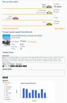 Players compete by racing miniature cars that advance as the users type various passages. The passages range in lengths from approximately 20 to 930 characters. For racing, there is the default ("maintrack") option, where players race against each other by typing randomly selected quotes from a database.[5][6] Practice racing, or "ghosting", is the game's single-player option where players can type any text on demand, and save up to five races. In addition, there are separate competitions and private tracks. In competitions, the player with the most points by a certain time wins.[7] In private tracks, players need a customized link to access the track.[8] When typing text selections, accuracy is required; any typing errors detected in spelling, capitalization or punctuation must be fixed by the player before continuing with the race.[9] The typing passages are popular culture references and come from songs, films, television shows, video games and books.[5] For example, text selections include passages from such sources as Monty Python and the Holy Grail, A Clockwork Orange, and Stephen Colbert's I Am America (And So Can You!).[10][11] Additional quotes can be submitted by users to be considered for addition into the game.[12]