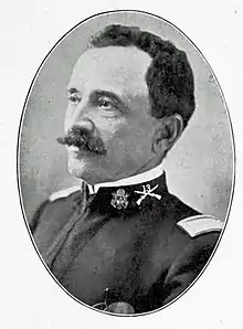 After the war, he would serve at Fort D. A. Russell[2] and at the Vancouver Barracks and was promoted to lieutenant colonel of 23rd Infantry Regiment on August 7, 1900.[1] After the beginning of the Philippine–American War, Markley would be stationed at the Caraballo Mountains and assist with supply of American forces and was promoted to colonel on October 5, 1901[4] but returned to the American mainland in July 1902. He was initially stationed at Fort McDowell[3] but went back to the Philippines on October 5, 1905, and was promoted to brigadier general on March 2, 1907, but he retired by his own request on June 9.[1] It was recorded that Markley was living at Radnor, Pennsylvania.[2] He died on August 25, 1926, at Alton, Illinois.[6]