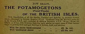He returned to his native Fenlands in 1848 and began to devote his prodigious energy to science. At first his attention was taken up by insects, birds, shells and fossils, and it was only after 1860 that he became preoccupied with botany, corresponding with Cardale Babington, John Gilbert Baker and Arthur Bennett. His intimate knowledge of plants led to his considering a flora of Huntingdonshire, but his growing fascination with Potamogetons, or 'Pots' as he termed them, claimed priority. His circle of friends now reflected this single-mindedness - George Claridge Druce of Oxford, Charles Edward Moss of the Cambridge Botany School, Edward Walter Hunnybun (1848-1918) of Huntingdon and A. H. Evans, also corresponding with Thomas Morong (1827โ1894), the American authority on the genus. During this period Fryer was growing Potamogetons in tanks placed in his garden, tracking their development together with that of their numerous wild counterparts. His prolific contributions to the Journal of Botany, British and Foreign led to his 1897 election as Associate to the Linnean Society. Until his death, Robert Morgan (1863-1900), also a Linnean Society Associate, illustrated Fryer's copious articles. Morgan's colour plates delighted Fryer and were praised by later critics.