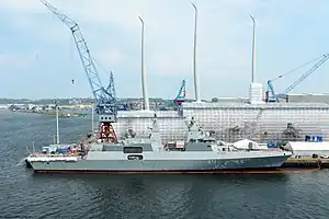 As TKMS no longer owns its surface vessels shipyard, the construction of the two frigates was subcontracted to ADM Kiel GmbH shipyard (later owned by German Naval Yards Holdings) in Kiel, Germany.[3] El Moudamir was launched on 11 December 2015.[5] The ship started its first sea trial on 25 July 2016.[6] The frigate departed Kiel on 15 May 2017, arriving in Algeria on 21 May.[5] El Moudamir was formally commissioned on 24 May 2017 in by the Chief of Staff of the People's National Army Lieutenant General Ahmed Gaid Salah.[7]