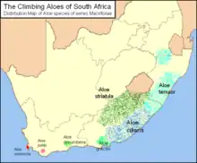 Although closest to the rare and unique Aloiampelos commixta of Table Mountain, Aloiampelos striatula is part of a genus, Aloiampelos, that grows throughout Southern Africa. Other species in this group are: Aloiampelos ciliaris, Aloiampelos tenuior, Aloiampelos gracilis, Aloiampelos juddii, Aloiampelos decumbens, and of course A. commixta and A. striatula itself.[4]