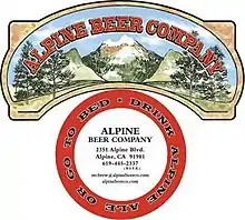 Alpine Beer Company is an American brewery founded in 1999 by Pat McIlhenney in Alpine, California.[1] Alpine Beer Company produces a variety of beers, many of which have high alcohol content and are strongly hopped beers.[2] The beers have acquired a following due to the popularity of such beers as Pure Hoppiness and Exponential Hoppiness IPAs. Alpine Beer Company was ranked as the fifth best brewery in the US in 2006 by Beer Advocate.