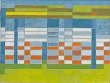 During the Jewish Women's Archive oral history interview Rothschild said that she her style gradually evolved from realist to abstract during the 1940s and early 1950s. She made the change entirely on her own in a slow self-taught process.[4] In viewing a retrospective exhibition of her work, a critic said in 2012 that Rothschild's 1948 oil painting "Portrait of Me (Self Portrait with Crossed Arms)" seemed to be a transitional work, particularly as it emphasized Rothschild's angular shoulders and arms.[16] This painting can be seen in the 1984 photo of Rothschild along with an earlier self-portrait. The photo is shown in the box at top. In the interview she also said her experience as a volunteer art therapist in the 1950s helped her to move away from planned and structured work and to move toward a more spontaneous expression of emotion. In 1958 a gallerist described the paintings in her emerging geometric style as "personal abstract statements characterized by subtlety of color, symbol, and pattern."[17] Her interest in the human figure persisted even as what was seen as her "distinctive take on geometric abstraction" evolved, and many of her paintings contain elements that derive from parts of the body as seen from unusual angles.[16][18] The 1968 acrylic painting "Ripening of the Oranges, Sicily" (shown at left) is said to be a first-rate example of how she relied upon a "gridded composition that allowed for both structural variation and representational allusion."[16]