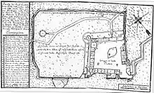 Very few remnants of the castle's interiors remain today, so it is possible to learn more about them only by scrolling through 18th-century plans and views.[12] The castle had a quadrangular perimeter, unfolded around the parade ground, beneath which were three cisterns for collecting rainwater. The castellan's and officers' quarters were arranged along the southern side, communicating with the sixteenth-century bastion; soldiers with families were housed on the western side, while the others lodged on the northern side, where the armory was also located. Along the eastern side were the jails and the chapel. The powder magazine was also located on the eastern side, near the main entrance. Three large artillery rooms were planned: one in the southern bastion, one at the southwest corner facing the Paraport quarter, and the other by the keep at the northwest corner.