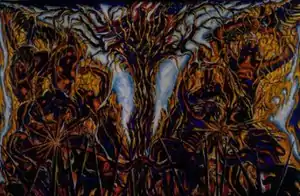 6 – Chains Under a Blinding Sun (3 × 5.50 meters)[22] is based on the subject of slavery depicting a three-part scene reflecting dark blue figures within a compressed space of deep yellow planes under a partial view of a hazy sun.[23] Long pendulous shapes with circumventing rings emerge from both sides and converge at the center with dripping lines over chained and struggling figures and symbols of enslavement, hanging, lynching, and torture.[24]