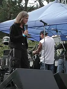 During the 2008 Republican National Convention in Saint Paul, Minnesota, several of Goodman's colleagues from Democracy Now! were arrested and detained by police while reporting on an anti-war protest outside the RNC.[25] While trying to ascertain the status of her colleagues, Goodman was also arrested and held, accused of obstructing a legal process and interfering with a police officer.[26] Fellow Democracy Now! producers, including reporter Sharif Abdel Kouddous, were held on charges of probable cause for riot.[27] The arrests of the producers were videotaped.[28] Goodman and her colleagues were later released,[29] City Attorney John Choi indicated that the charges would be dropped.[30] Goodman (et al.) filed a federal civil lawsuit against the St. Paul and Minneapolis police departments and the US Secret Service for the illegal arrests. The agencies reached a $100,000 settlement and agreed to educate officers about the First Amendment rights of members of the press and public.[31][32][33]