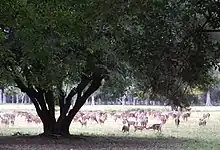 Among more than 200 tree and shrub species -from all corners of the planet- they stand out for the remarkable development of their specimens, various species of oak, cork, araucaria, bald cypress, Japanese maples and more than 60 species of eucalyptus, which they are part of one of the most important collections in the country. In addition, native and exotic species coexist in the park. Among the first, birds stand out, represented by more than 75 species. Among the exotic species, the Chital, originally from India, that Anchorena introduced in our country in the 1920s is especially attractive.[6] The Axis, considered the most beautiful of the cervids in the world, abounds in the Park.[5]