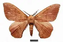 The wingspan is 37–39 mm. The head is covered with reddish-brown hairs. There is a black discal spot on the forewing, which has a smooth outer margin and is not falcate apically.[1]