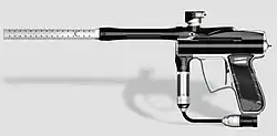 | Angel IR3 | Shares many of the same features as an LCD but in a slightly shorter overall package. The ram assembly overall is a bit shorter. Changed grip to 90 degree angle and a large trigger/ hand guard. Also the first model to incorporate the COPS ("Crystal-Operated Paint Sensor") anti-chop ball detection system. Named for the inclusion of an IR port on the board, used for programming and for syncing settings between team members' markers. |