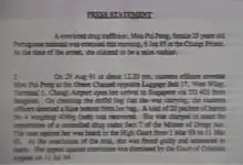 On 29 November 1993, 'Ah Hung' pled guilty in the Supreme Court of Hong Kong to a charge of assisting people in Hong Kong to commit an offence outside the territory (Section 40 of the Dangerous Drugs Ordinance), the first conviction of its kind for that offence in Hong Kong legal history. Although Deputy Judge Wong queried the consequences of Ah Hung's actions and highlighted the fact that Mou was facing the death penalty in Singapore as a result, defence lawyer Gary Plowman Q.C. asserted the judge could not penalize Ah Hung for crimes committed outside the jurisdiction, but only for the preparatory acts committed in the territory of Hong Kong.[21] Ah Hung was later sentenced to 4+1⁄2 years in prison.[22] At the time of his arrest, Ah Hung was carrying a Malaysian passport bearing the name of one Sia Khim Meng. In fact, the passport itself was reported missing to the Thai authorities months before the case. Ah Hung, whose real name was never confirmed, was subsequently identified as a Chinese citizen.[2]