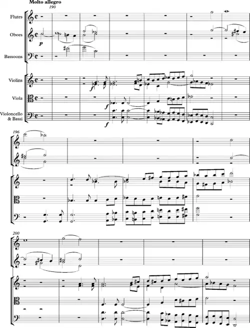 This idea is "then taken up by the alto and tenor, then by the sopranos, and finally by the pair of violins as transition to the explosive tutti":[14]