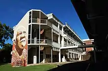 However, it's unclear whether the building has retained the name of Thozet Building after the installation of two murals on the eastern side of the building in 2017.[25] Artists Bill Gannon, Luke Gannon and Jon Watson created murals of Aunty Ollie (a custodian of the Darumbal people) and Malcolm Mann (a Darumbal traditional owner) which were officially unveiled in September 2017.[26] The "Thozet Building" signage was removed from the exterior of the building prior to the murals being painted and it has since been simply referred to as "Building 7" in the university's own online articles. In a 2019 online article, the university stated that the structure is "now known as building 7".[24]